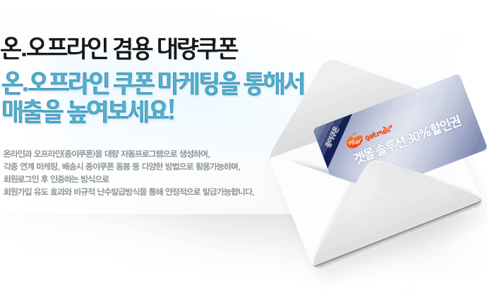 ÄíÆùÀ» »ý¼ºÇÑ ÈÄ, »ý¼ºµÈ ÄíÆù¹øÈ£¸¦ ¿ÀÇÁ¶óÀÎ ÄíÆù¿¡ Àμ⸦ ÇÏ¿© °í°´¿¡°Ô Áö±ÞÀ» ÇÏ¸é °í°´Àº ÄíÆù¹øÈ£¸¦ ¼îÇθô¿¡¼ µî·ÏÇÑ ÈÄ »ç¿ëÇÒ ¼ö ÀÖ½À´Ï´Ù. ÀÌÁ¦ ¿Â¶óÀÎ ¸¶ÄÉÆÃ »Ó¸¸ ¾Æ´Ï¶ó, ¿ÀÇÁ¶óÀÎ ÄíÆù ¸¶ÄÉÆÃÀ» ÅëÇØ¼ ¸ÅÃâÀ» ³ô¿©º¸¼¼¿ä. |