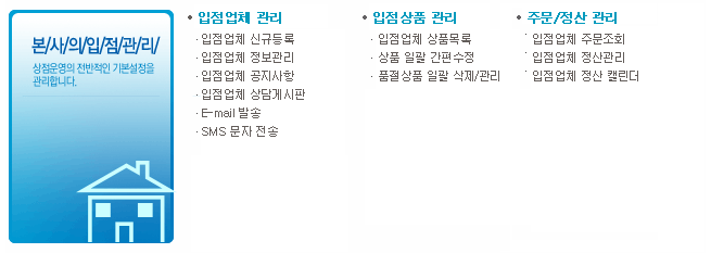 º»»çÀÇ ÀÔÁ¡°ü¸® ¸Þ´º Á¾ÇÕ¸ô°ú µ¿ÀÏÇÑ ¼öÁØÀÇ ÀÔÁ¡»ç ±â´É ¹× mall in mall ºÐ¾ç Á¤µµ±îÁö °¡´É Çϵµ·Ï ÇÑ´Ù. |