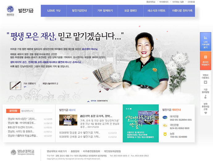 YU Glocal initiative¸¦ ´ëÇÐÀÇ ¹öÀüÀ¸·Î ¼±Æ÷ÇÏ°í ´ã´ëÇÑ º¯È¸¦ ÃßÁøÇϰí ÀÖ´Â ¿µ³²´ëÇб³ÀÇ 2010³â 10´ë Àü·«»ç¾÷ÀÇ ÀÏȯÀ¸·Î ±¸ÃàµÈ ¿µ³²´ëÇб³ ¹ßÀü±â±Ý ȨÆäÀÌÁö ±¸Ãà.