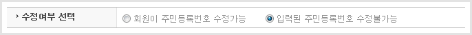 • - ȸ¿ø°¡ÀÔ ÈÄ È¸¿øÁ¤º¸ ¼öÁ¤¿¡¼­ ÁֹιøÈ£ÀÇ º¯°æ°¡´É À¯¹«¸¦ ¼³Á¤ÇÒ ¼ö ÀÖ½À´Ï´Ù.